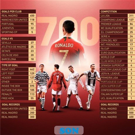 After just five goals at Sporting Lisbon, the Portuguese landed 118 at Manchester United, 450 at Real Madrid, 95 for Portugal and 32 for his current club Juventus.