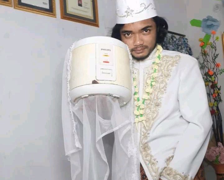 An indonesian man identified as Khoirul Anam recently shared the wedding photos of his marriage to his rice cooker on his verified facebook page.
